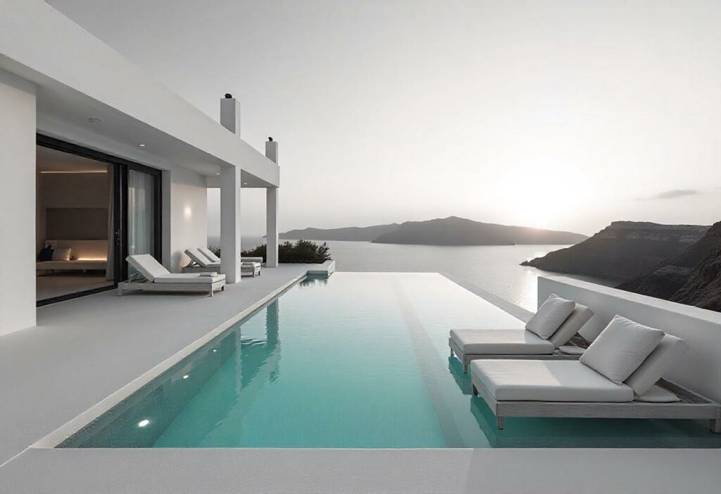 Eine elegante, minimalistische Villa mit offenen Wohnbereichen, großen Fenstern und einem nahtlosen Übergang zwischen Innen- und Außenbereich, konzipiert für modernen Luxus in einem pulsierenden urbanen Umfeld.